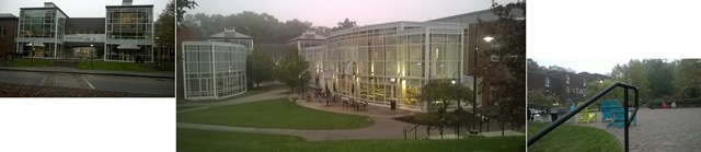 However, when you go up the steps (left photograph above) and under the glass enclosed covered bridge and look back you may experience a sense of awe as you gaze at the glass encased wonder that is the Reynolds Student Center (center photograph above). As you walk away and along the walkway, up the series of steps that caress the patio garden with colorful chairs (right photograph above) and leads up to Map Hill Drive, take a moment and reflect on the vision. Was not the awesome vision built with familiar design principles and materials but used thoughtfully in new ways?