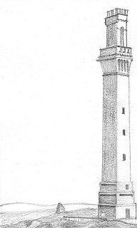 Drawing is a monochrome sketch of a selected subject made with a writing instrument using the principles of perspective and light for the purpose of evoking contemplation. Drawing consists of the selective indication of a few attributes from the collection of all attributes that make up the subject. For instance, notice the use of perspective for 3D effect and the use of shading to indicate shadows. Additionally, the selection of the vantage point that starkly contrasts the horizontal landscape on the left with the vertical rise of the monument makes the tower the focus of attention.