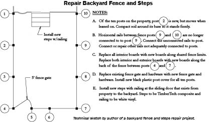 Engineering drawing, on the other hand, is a monochrome sketch of a design for a utilitarian object made with a writing instrument using the principles of orthographic projection and methods of construction for the purpose of implementing, operating, or maintaining a design. Engineering drawing consists of the complete indication of all components and their arrangement for the design that is supplemented with construction specifications and methods. For instance, the line work for the fence repair project below is a schematic plan view that is supplemented with symbols, the bubble call-outs for instance, and notes specifying attributes and construction methods.